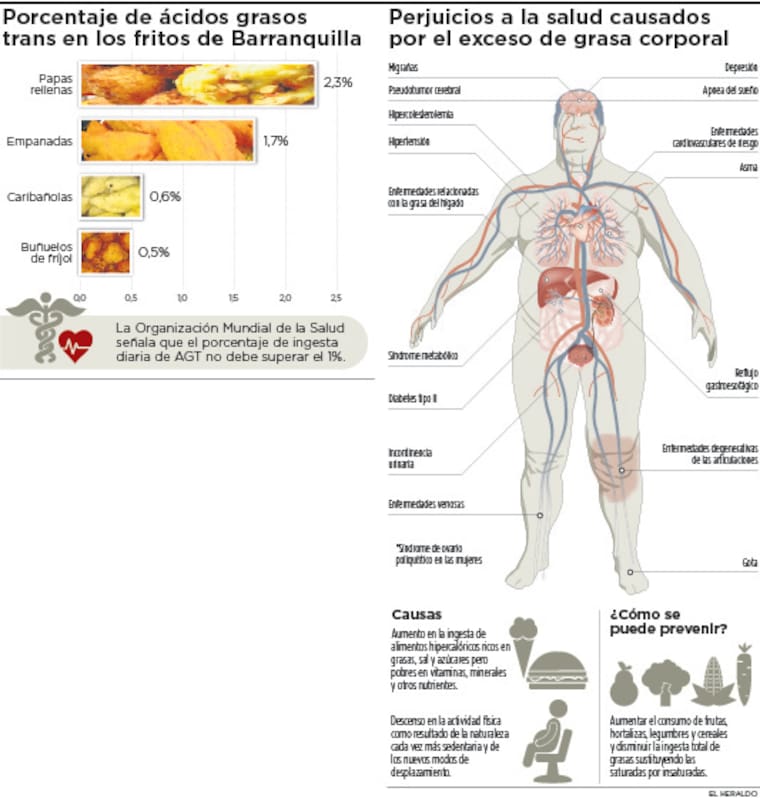 Es decir, las afecciones cardiacas, la diabetes, obesidad, problemas digestivos y renales se cocinan en el caldero. Para el ingeniero Cabarcas, pese a los riesgos, es poco el control en alimentos que se expenden en la ciudad, sobre todo en el tema de las grasas trans. Los especialistas concuerdan en que es un tema de educación, que es necesario formar buenos hábitos en las nuevas generaciones.