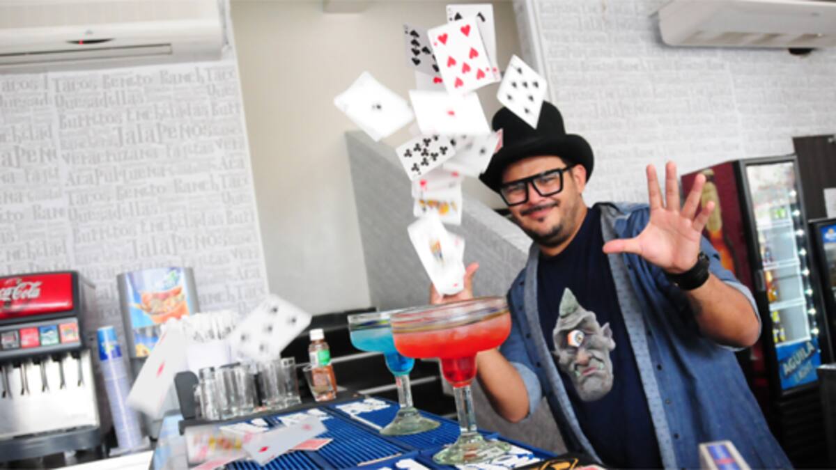El otro se lo hizo el artista Tavo Paternina. Son cuatros ases que parecen ir en el aire, como los que ahora lanza sobre dos cocteles para las fotos. También es barman y ha podido, como por arte de magia, sincronizar todas sus destrezas.