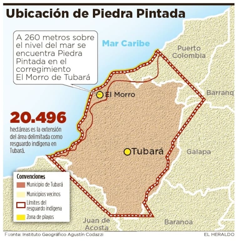 Para llegar a Piedra Pintada, el petroglifo Mokaná de más de 900 años, hay que partir de la capilla de El Morro, corregimiento del municipio de Tubará, y desde allí subir el cerro por el camino llamado el Cielo.