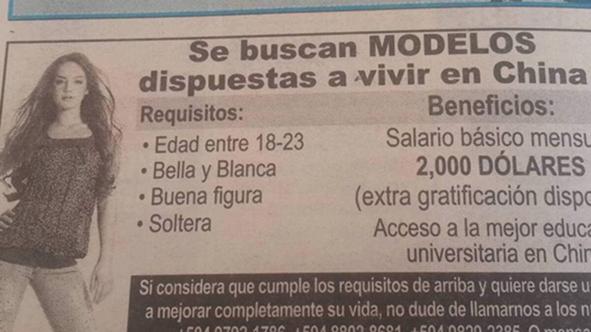 'Se buscan modelos dispuestas a vivir en China. Requisitos: edad entre 18 y 23, bella y blanca, buena figura y soltera. Salario básico mensual de 2.000 dólares. Extra gratificación disponible y acceso a la mejor educación universitaria en China', se leía en el anuncio.