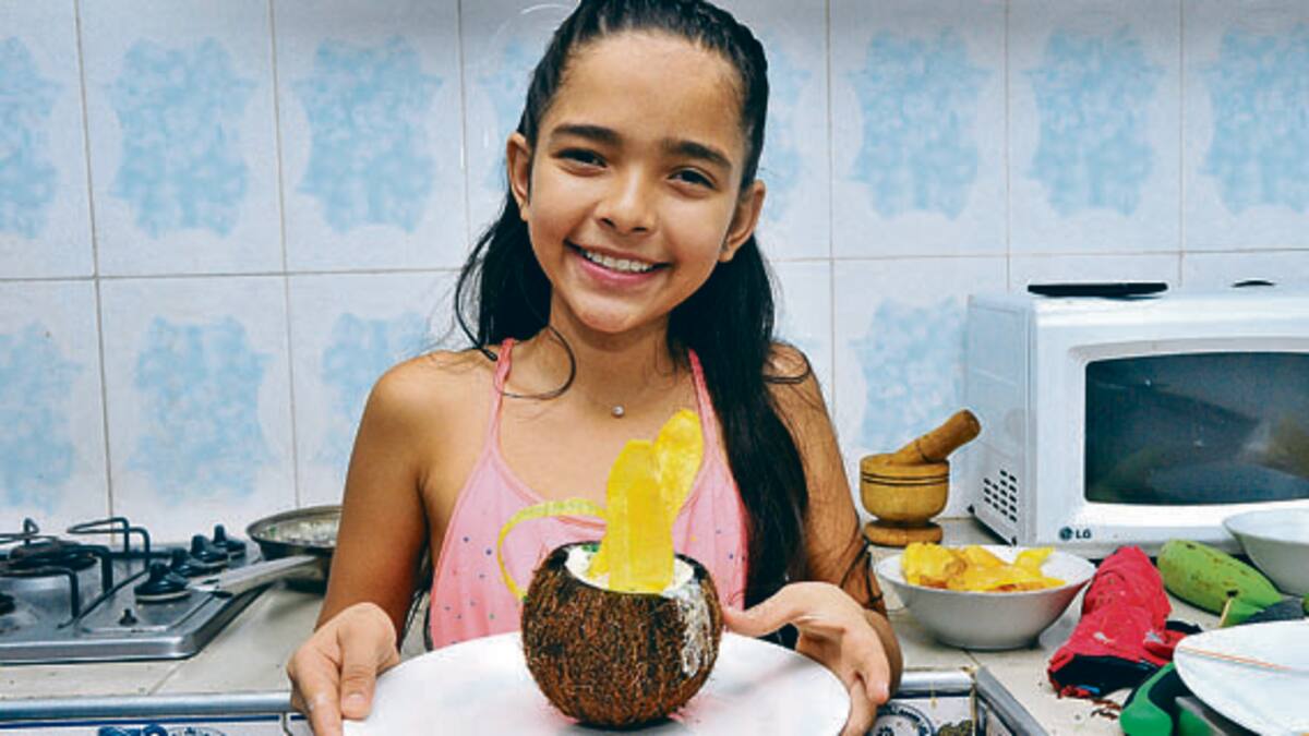 La pequeña chef, nombrada por el chef Jorge Rausch como 'la reina de la sazón', no encuentra las palabras para describir de dónde viene el secreto de su sabor culinario; sin embargo, toma el tarro de la sal con mucha propiedad y con el ceño fruncido mira fijamente sus pequeños dedos mientras salpica los camarones que intenta descongelar para la preparación de su platillo favorito –Camarones en leche de coco y chips de plátano– que realizó ayer desde su casa para los lectores de esta casa editorial.