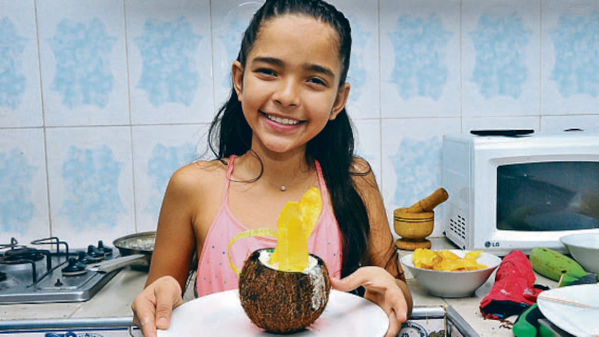 La pequeña chef, nombrada por el chef Jorge Rausch como 'la reina de la sazón', no encuentra las palabras para describir de dónde viene el secreto de su sabor culinario; sin embargo, toma el tarro de la sal con mucha propiedad y con el ceño fruncido mira fijamente sus pequeños dedos mientras salpica los camarones que intenta descongelar para la preparación de su platillo favorito –Camarones en leche de coco y chips de plátano– que realizó ayer desde su casa para los lectores de esta casa editorial.