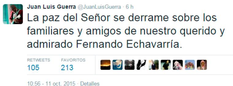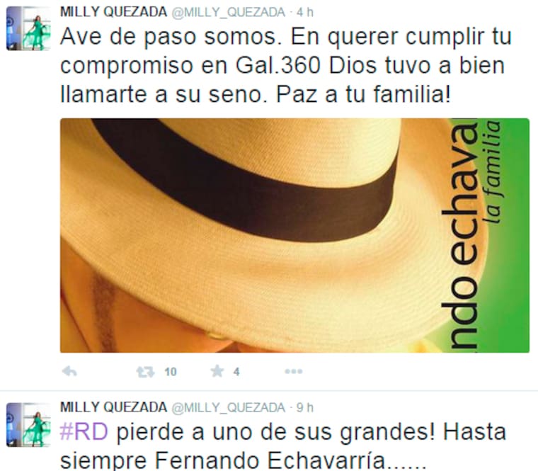 'RD de luto! Con profundo pesar te decimos 'Hasta Siempre' Fernando Echavarría... Que en paz descanses!', escribió en su cuenta en Twitter la cantante Milly Quezada, conocida como la reina del merengue.