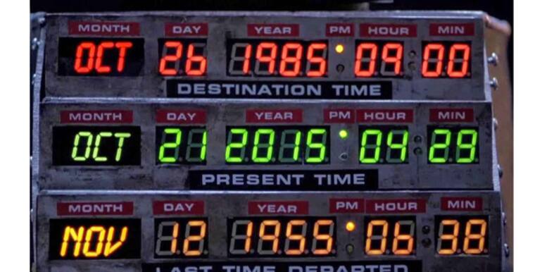 'Está bien, Doc ¿Qué pasa, eh? ¿Dónde estamos? ¿Cuándo estamos?', pregunta Marty McFly al doctor Emmett Brown, mientras este levanta sus lentes futuristas, mira el calendario temporal del DeLorean y anuncia: 'Nos dirigimos a Hill Valley, California, a las 4:29 p.m., miércoles, 21 de octubre, 2015'.