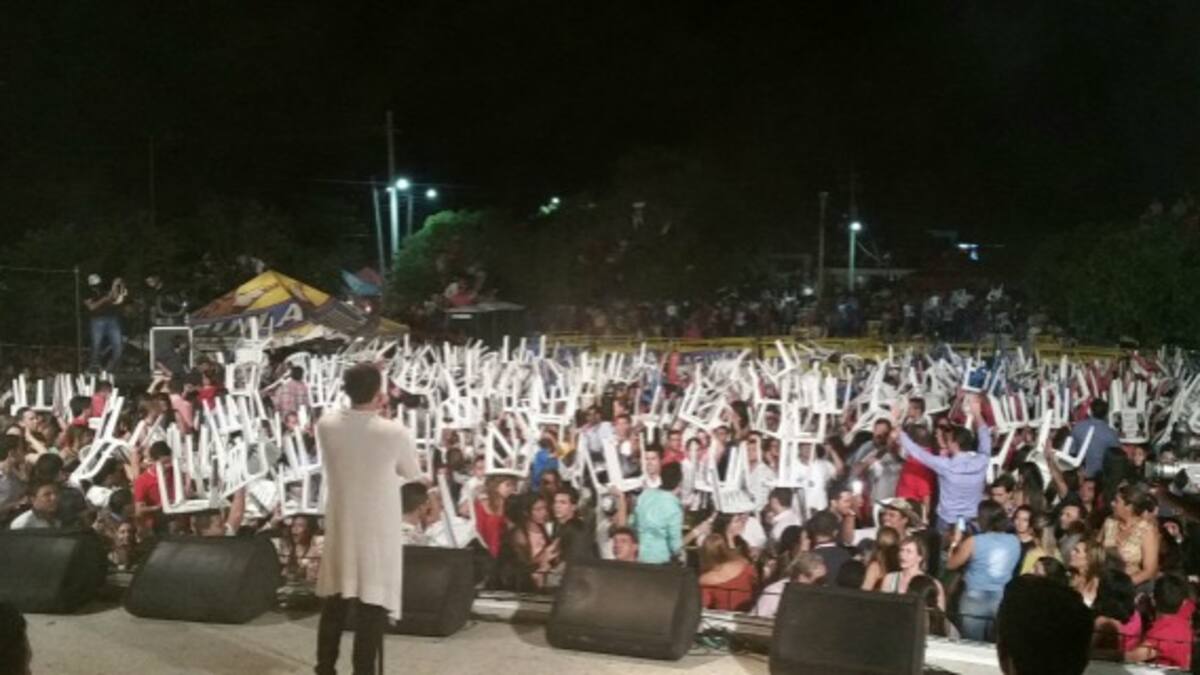 Una lluvia de botellas, sillas, mesas y todo tipo de elementos fue lanzada por el público hacia la tarima donde se encontraba Silvestre. El artista pidió 'calma y prudencia' para continuar su espectáculo, pero no fue escuchado.