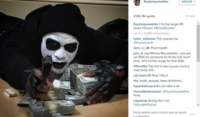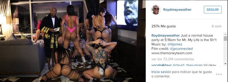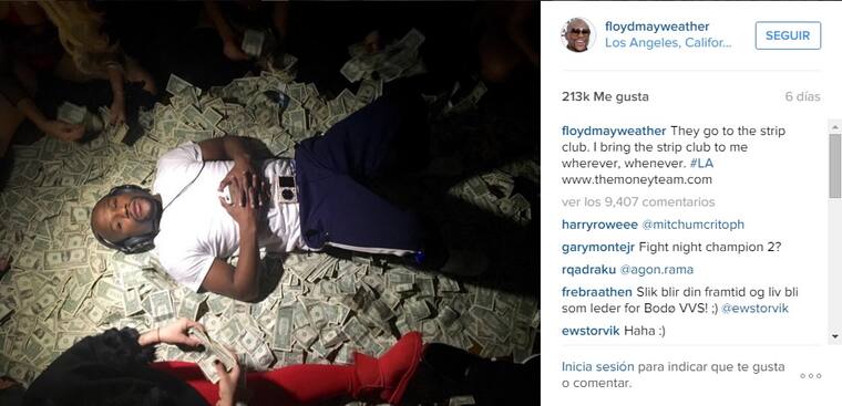La última de Mayweather fue montar en su propia casa un club de strippers, y así lo explica en una imagen en la que aparece encima de un montón de billetes y cita: 'Ellos van al club de striptease. Yo me traigo el club de striptease donde quiera y cuando quiera'.