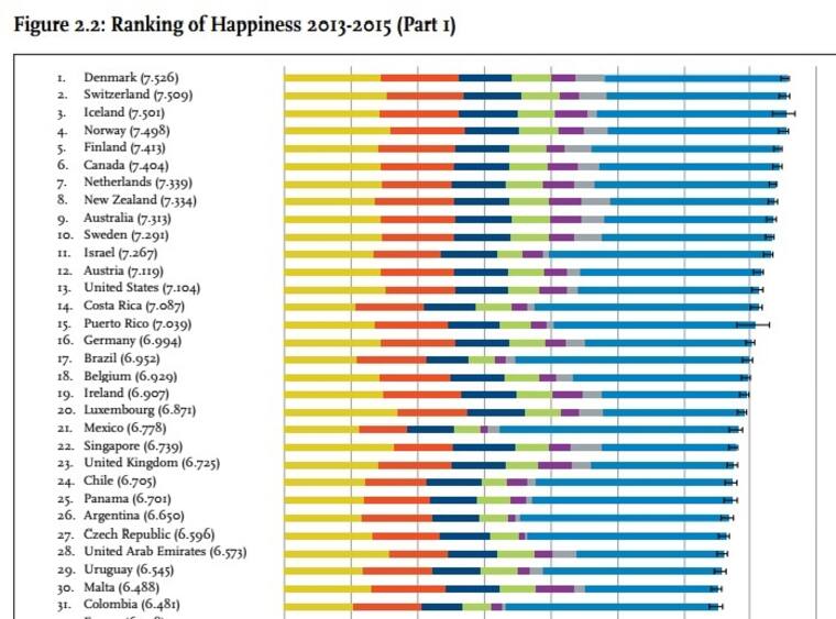Colombia se ubica en el puesto 31 en el Informe Mundial de la Felicidad 2016, un estudio elaborado por un panel de expertos a instancias de Naciones Unidas y que fue presentado en Roma. Costa Rica y Puerto Rico, por Latinoamérica están entre los países del mundo más felices. (Ver infografía)