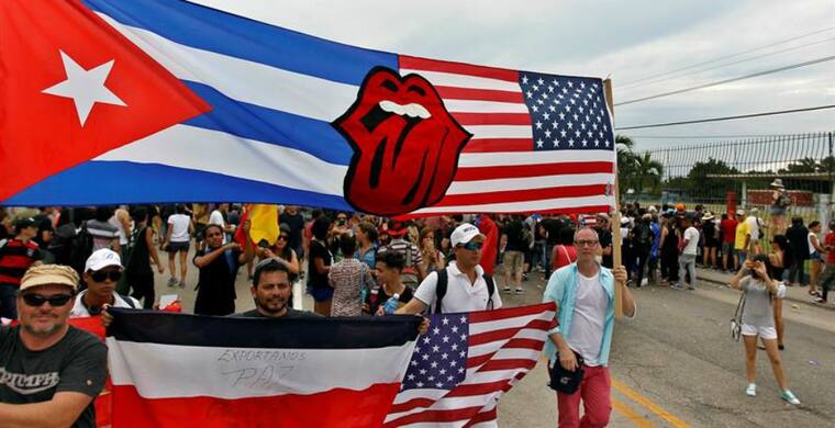 Símbolo de los nuevos tiempos en Cuba: desde primeras horas se veía una bandera que combinaba las barras y estrellas de EEUU, y la de Cuba, unidas por ese logo de los Stones, creado en 1971 e inspirado en los "morritos" del líder y vocalista Mick Jagger.