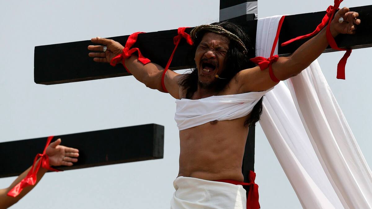 Ruben Enaje formó parte de un grupo de una quincena de personas que se crucificaron en esa población para emular el sufrimiento bíblico de Cristo a manos de los soldados romanos, interpretados por locales disfrazados con cascos de metal y túnicas rojas.