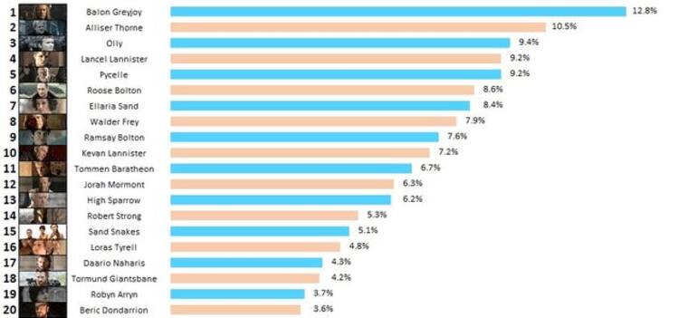 Un usuario de Reddit preguntó a la comunidad quién sería el próximo personaje de Game of Thrones en morir y la respuesta fue masiva. Más de 7.000 personas dieron su candidato o candidata que creen, causará baja de la serie en la sexta temporada. Como era demasiado feo escribir el nombre y contar los votos, han elaborado una infografía con porcentajes en la que se sitúa a la cabeza Balon Greyjoy con un 12,8%.