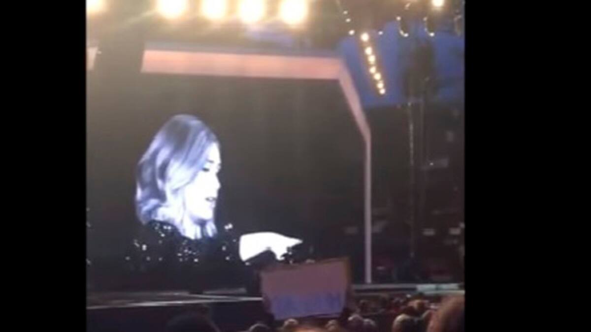 En medio de la actuación, Adele gira hacía donde estaba ubicada la mujer, y con tono de enojo, le pide de que deje de grabar y disfrute del concierto.