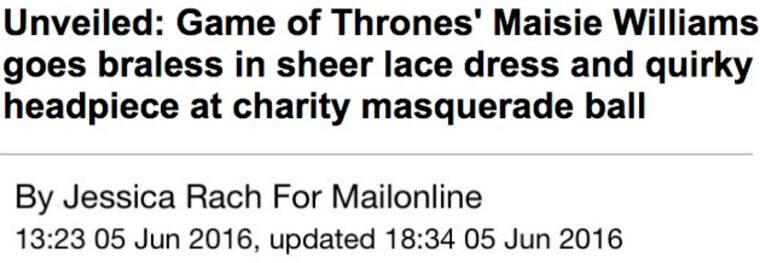El diario encabezó su noticia diciendo: 'Increible: Maisie Williams de Game of Thrones va sin brasier bajo vestido de encaje transparente y con un extravagante tocado a baile de disfraces benéfico'.