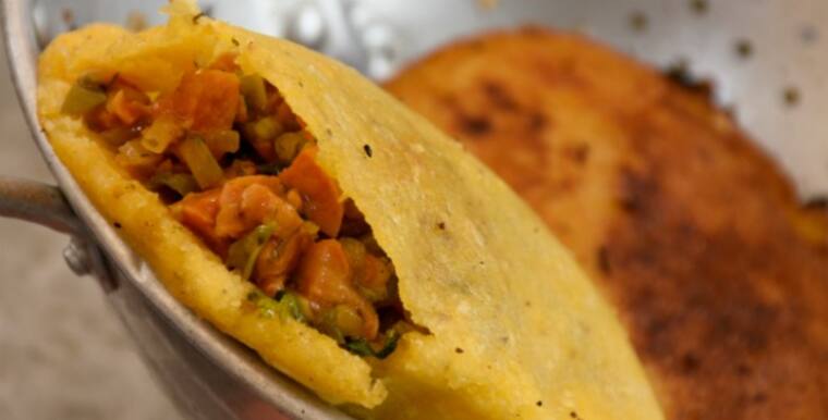 Su destreza la pone a prueba con cada nuevo invento. Esa mañana se le ocurrió innovar, 'siempre es la arepa de huevo solo o con carne, o hasta pollo cuando me queda del que uso para los patacones. Pero como habrán arepas trifásicas en el festival se me ocurrió la idea de hacerlas con chorizo, camarón y butifarra. Eso sí, todas con guiso', cuenta Mayra.