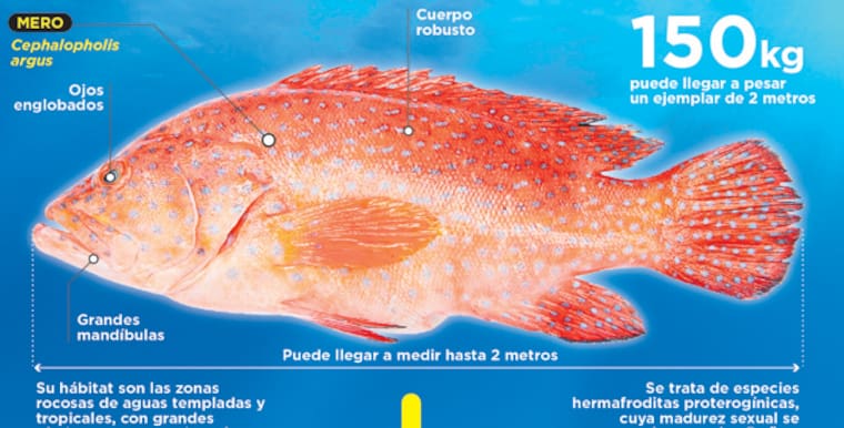 El tamaño normal de un pez, como la tilapia, es de 35 centímetros. Pero el mero tiene una característica particular que lo hace diferente al resto de peces: puede llegar a medir cerca de tres metros y pesar alrededor de 400 kilos. Mientras que un pez león alcanza a medir máximo 40 centímetros; raza que se unió a la dieta alimenticia del mero.
