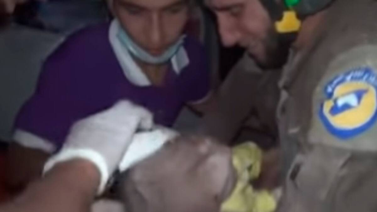 Un rescatista lloró de emoción al encontrar a un bebé vivo entre los escombros de un edificio destruido por bombardeos en Siria.
