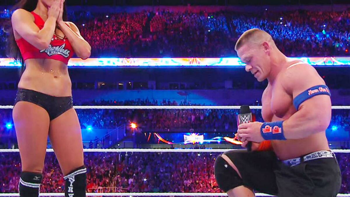 La dupla que se llevó el combate fue la conformada por Cena y Bella, pero antes de dejar el escenario John Cena pidió el micrófono y sorprendió a su amada Nikki cuando este se arrodilló frente a ella para pedirle su mano en matrimonio. 'Había esperado tanto tiempo para preguntarte esto: ¿Te quieres casar conmigo?', dijo Cena, a lo que Bella respondió con un sí, sellando su compromiso frente al público con un tierno beso.