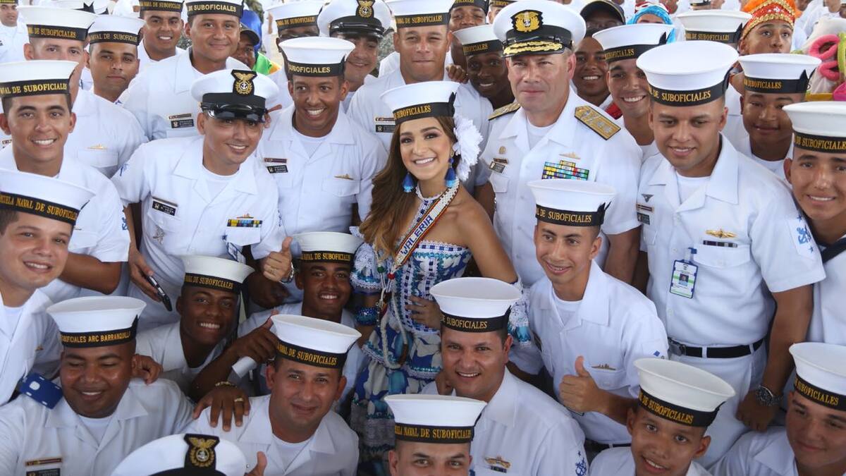 Valeria Abuchaibe Rosales, soberana del Carnaval de Barranquila 2018, lideró ayer la formación militar que diariamente se realiza para izar el Pabellón Nacional en la Escuela Naval de Suboficiales ARC 'Barranquilla'. Allí fue homenajeada y proclamada como la Soberana de los Marinos.