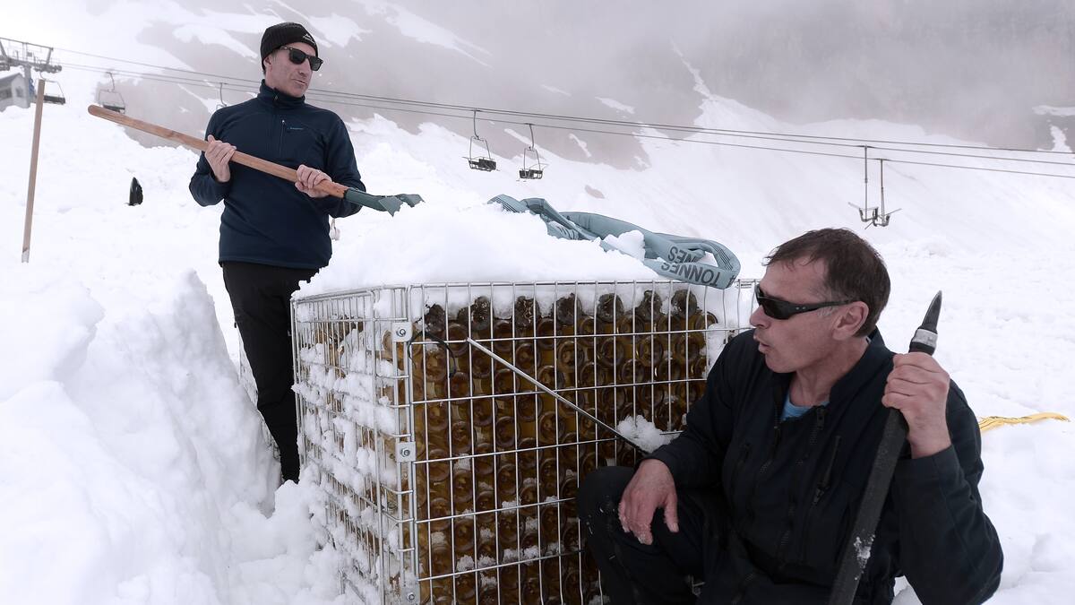 '¡Ya está, por fin las hemos sacado!'. Con una pala, el viticultor Franck Labeyrie cavó un buen rato en una estación de esquí de los Pirineos franceses para recuperar su tesoro: unas botellas de vino sepultadas bajo la nieve, a 2.400 metros de altitud.