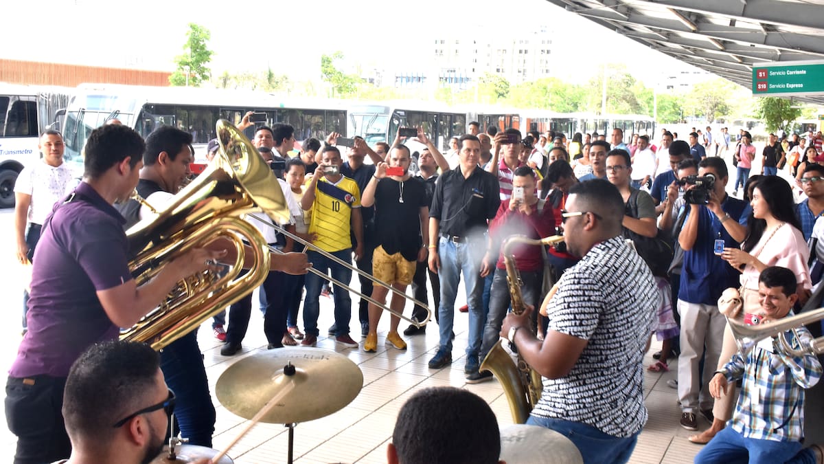 Al sonar la primera trompeta, muchos transeúntes se detuvieron a apreciar la muestra musical. Álvaro Ávila esperaba un articulado con destino a la estación Portal de Soledad, pero no dudó en salirse de la fila y tomar un lugar para grabar a Papayebrass.