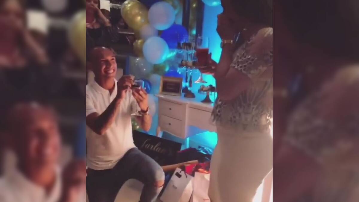 La joven barranquillera fue la encargada de publicar los videos en sus historias de Instagram, mostrando el sorpresivo momento en que el futbolista se encuentra dando palabras de agradecimiento por acompañarlo en su celebración y aprovecha para sacar el anillo, arrodillarse y hacerle la propuesta.