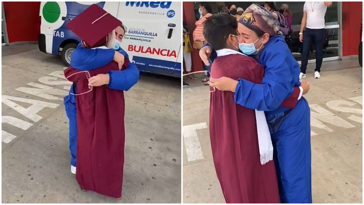 Emmanuel Peralta Ochoa, de 10 años, quien se encontraba vestido con una toga color vinotinto y un birrete, esperó con ansias en la entrada del centro de salud a su tía Clara Ochoa para celebrar su graduación de primaria.