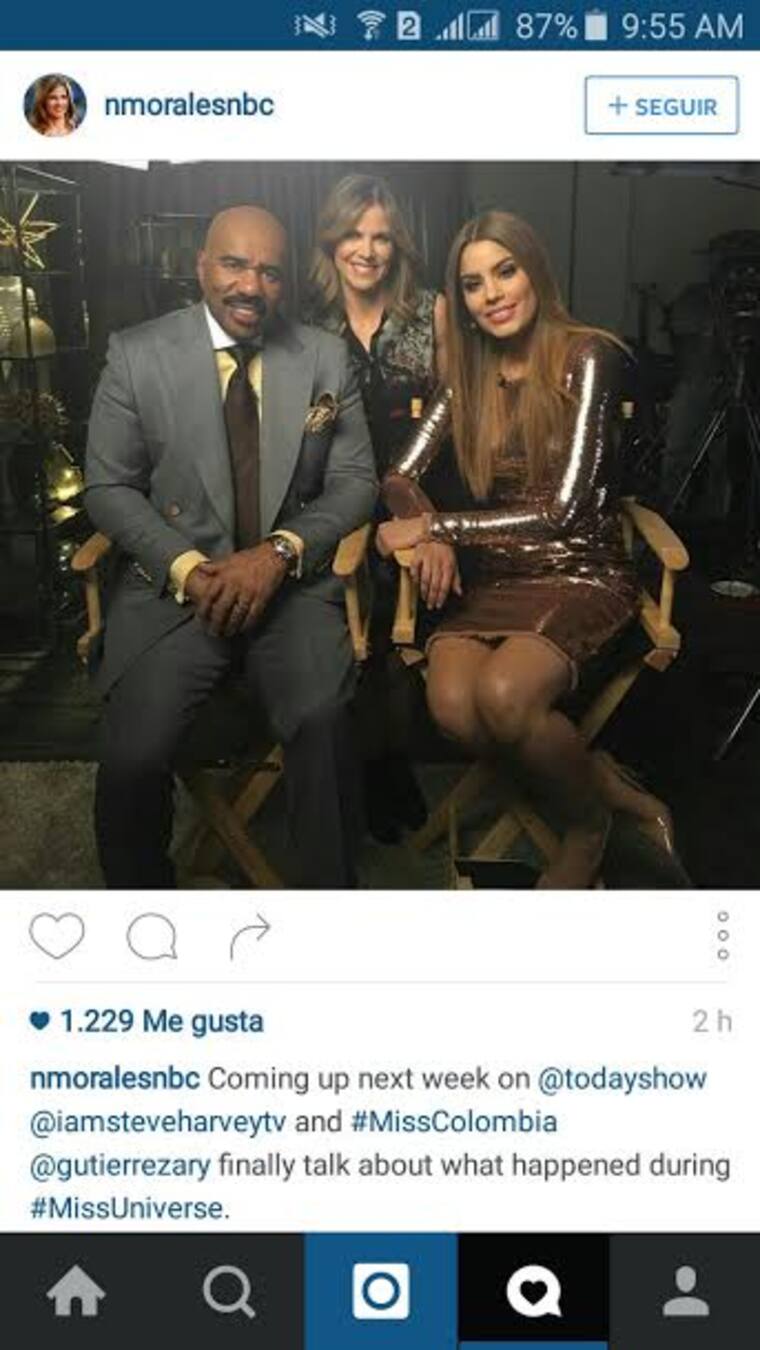 El mensaje que la presentadora escribió en la fotografía fue: 'La próxima semana en @todayshow @imsteveharveytv y #MissColombia @gutierrezary finalmente hablan sobre lo que pasó en #MissUniverso'