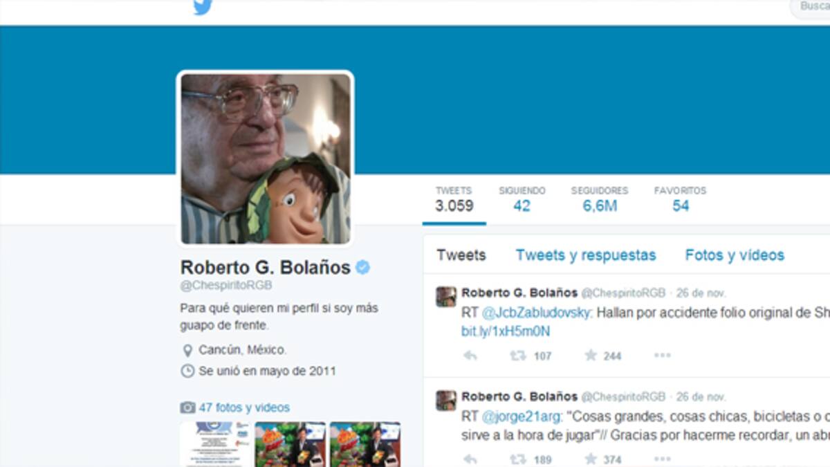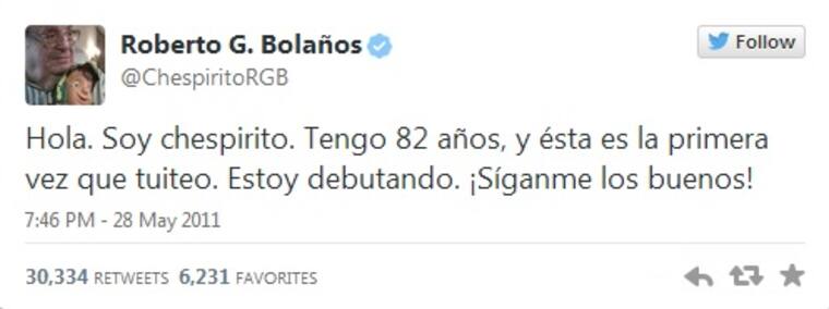 'Hola. Soy chespirito. Tengo 82 años, y ésta es la primera vez que tuiteo. Estoy debutando. ¡Síganme los buenos!'. Con ese mensaje, publicado el 28 de mayo del 2011, Roberto Gómez Bolaños empezaría su vida en Twitter, una red social que siempre demostró cariño a uno de los más grandes comediantes de la televisión latina.