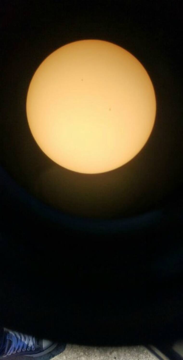 A las 8:30 de la mañana, con los cielos más despejados, todos subieron a la azotea donde los telescopios y binoculares -adaptados con filtros solares- ya apuntaban al disco solar. La mañana avanzó y las condiciones climáticas mejoraron, disminuyendo la nubosidad y, con el Sol en pleno, fue necesario incorporar un par de sombrillas a la jornada.