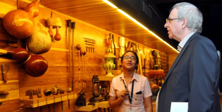 La guía del Parque Cultural del Caribe le explica al historiador los usos de los objetos cotidianos del Caribe.
