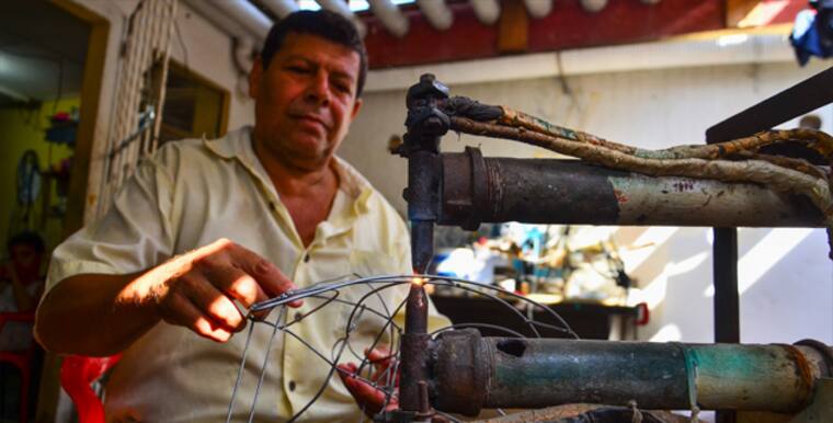 Rafael Manjarrés se encarga de soldar los alambres para las estructuras de los tocados.