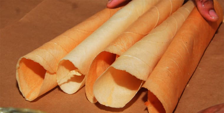 Todo el proceso de este producto comienza desde la mezcla de azúcar, harina de trigo, aceite y agua, la cual se bate una y otra vez hasta que está lista para introducirla en un quemador de potencia industrial y aspecto artesanal, en el que tarda alrededor de 45 segundos para formarse y convertirse en una hoja dulce y crocante que se dobla hasta envolverla en sí misma en forma de espiral. Luego, con igual rapidez, se reúnen esos cilindros aplastados y se envuelven en papel kraft.