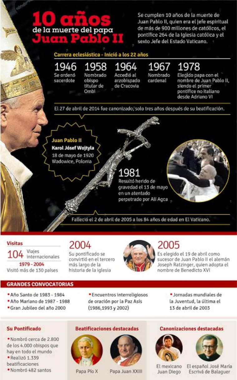 En estos 10 años, la figura del papa de los récords, con sus 26 años de pontificado y 104 viajes fuera de Italia, no ha dejado de ser recordada en las eventos católicos con los fieles que aún llevan a San Pedro las fotos recuerdo de Wojtyla.