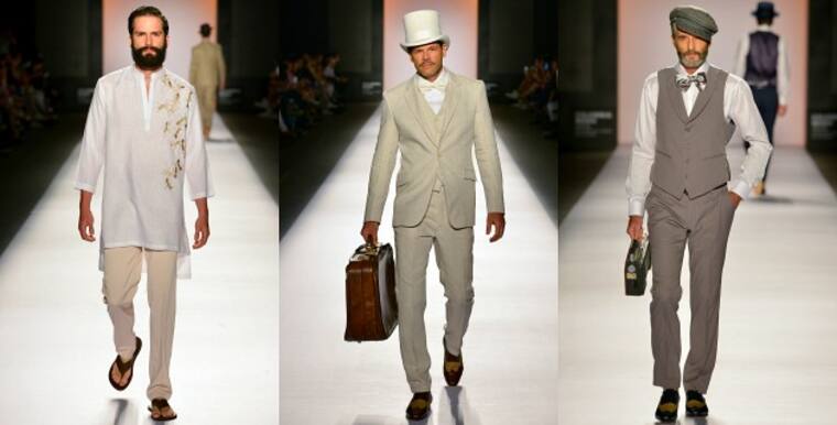 En esta muestra, el diseñador de ropa masculina decidió abrir el desfile en cabeza del empresario Juan del Mar, quien portó un traje color blanco hueso, sombrero blanco de copa y una maleta como accesorio.