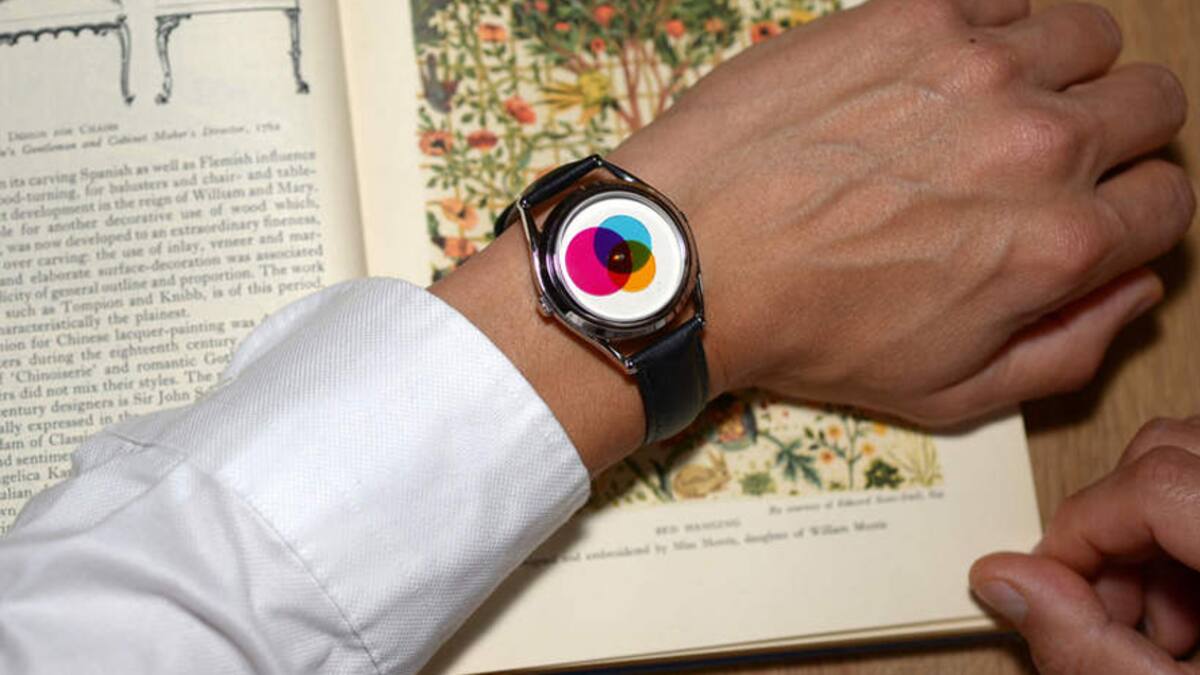 Un nuevo reloj de pulsera llega para sorprender, pues en vez de tener manecillas que indiquen la hora, los minutos o segundos, este tiene tres círculos de diferentes tamaños y colores (azul, fucsia y amarillo).