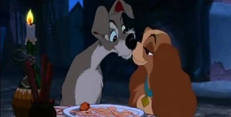 La dama y el vagabundo. La popular película de Disney trae consigo el beso inadvertido que se dan los dos caninos mientras sorben el mismo plato de espaguetis.