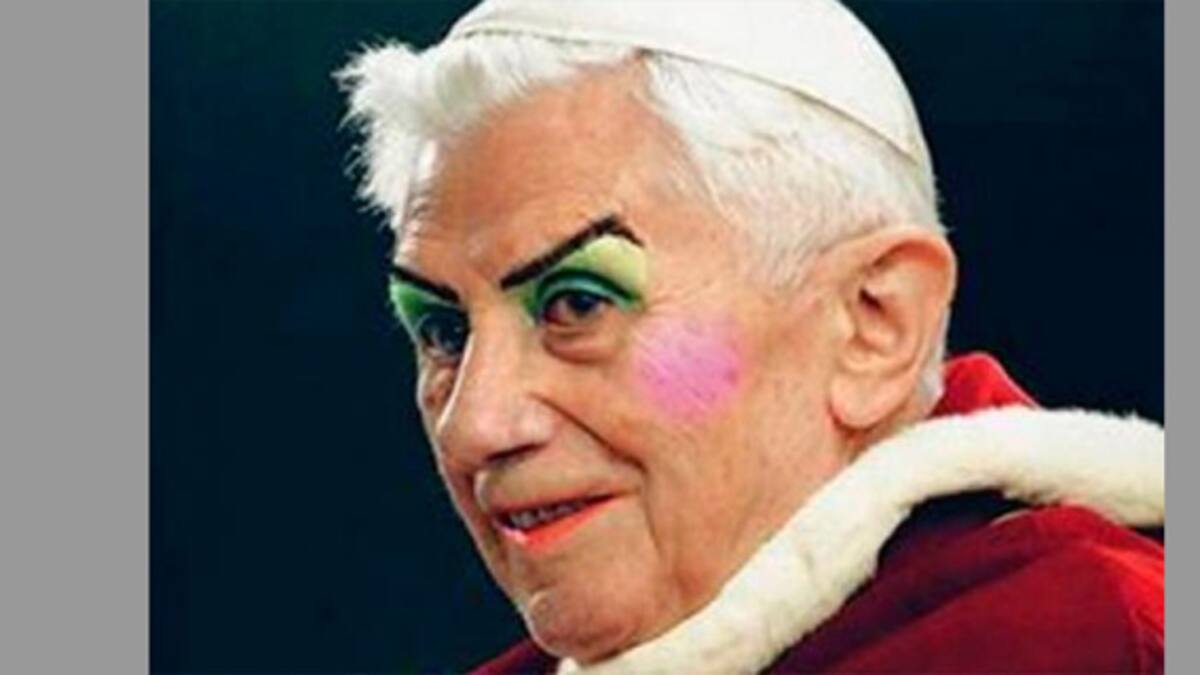 La imagen del festival, organizado en la Universidad Estatal de Milán (Italia) por una asociación de estudiantes, fue publicada ayer por el diario Corriere della Sera en su edición digital, y en ella se puede apreciar el rostro de Joseph Ratzinger con los ojos pintados con sombra verde, colorete, las cejas perfiladas y pintalabios, de forma muy llamativa, a través de un retoque por ordenador.