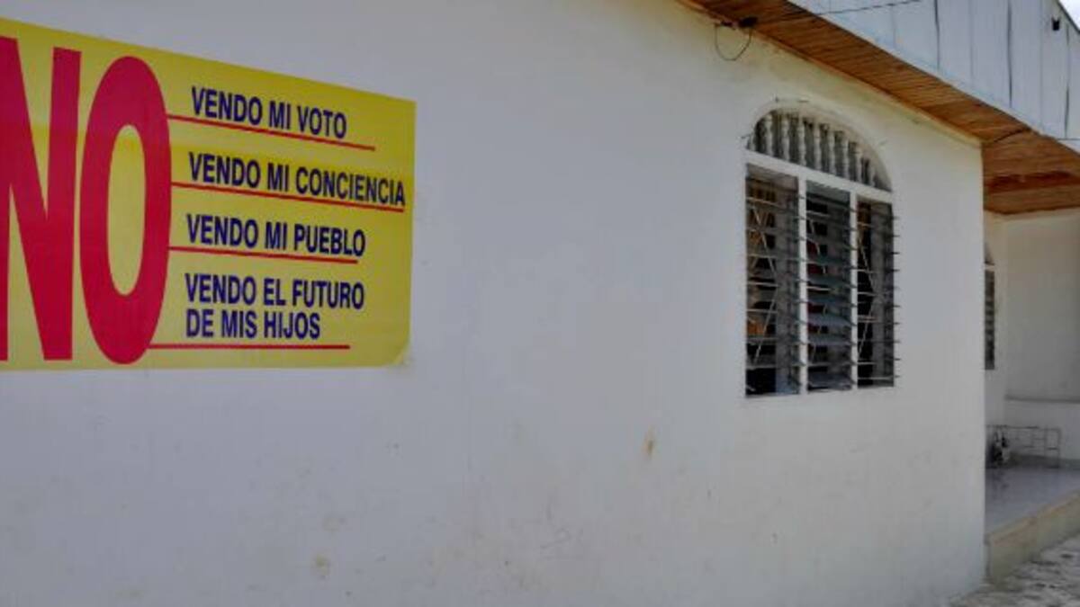 'No vendo: mi voto, mi conciencia, mi pueblo, el futuro de mis hijos', dice el letrero que sobresale en una de las paredes de la vivienda.