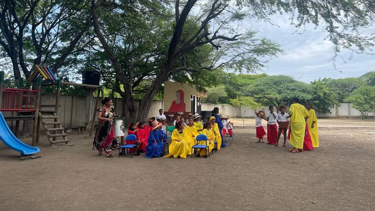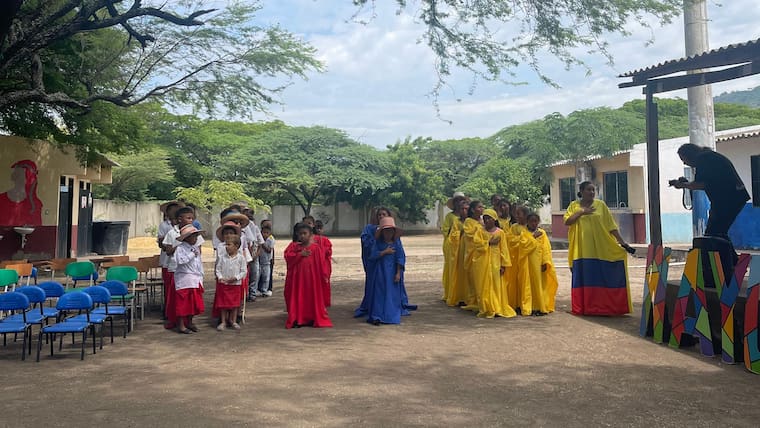 Las niñas usan las mantas guajiras y los niños los wayucos, trajes típicos de la cultura wayuu colombiana. Además entonan el Himno Nacional de Colombia en el idioma wayuunaiki, una interpretación que eriza los corazones y llena de lágrimas los ojos de muchos turistas, por su belleza.