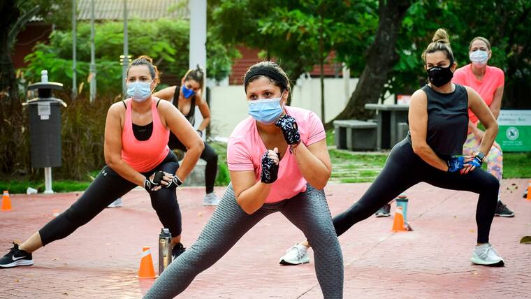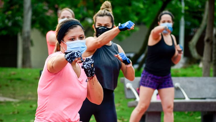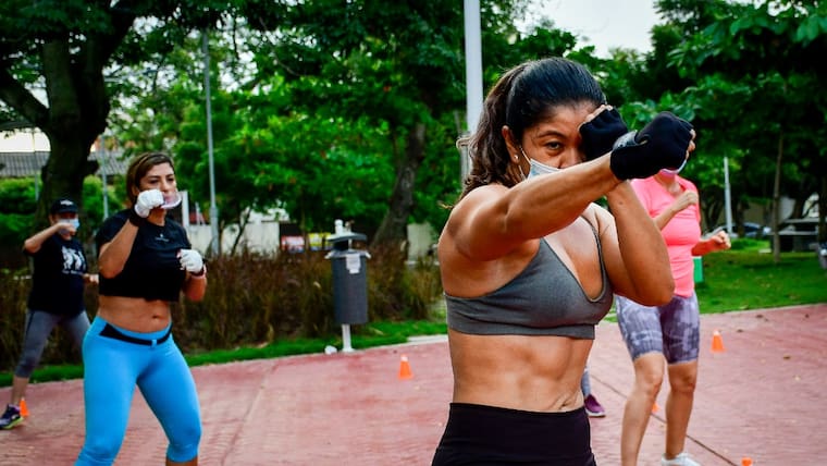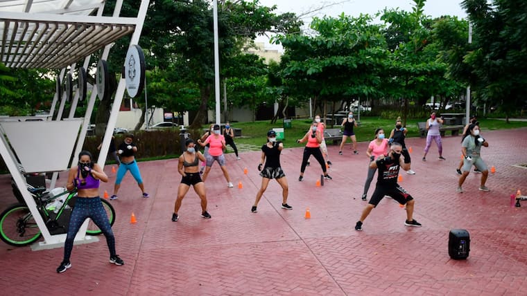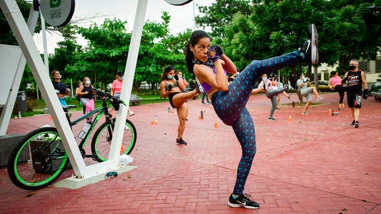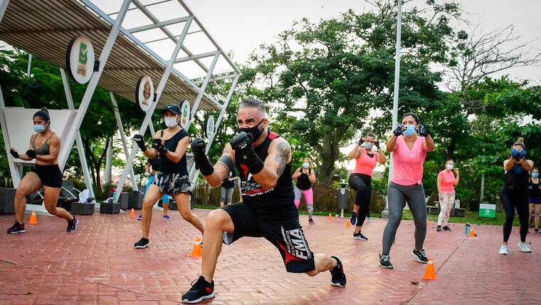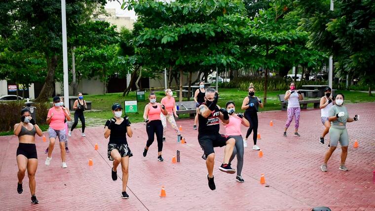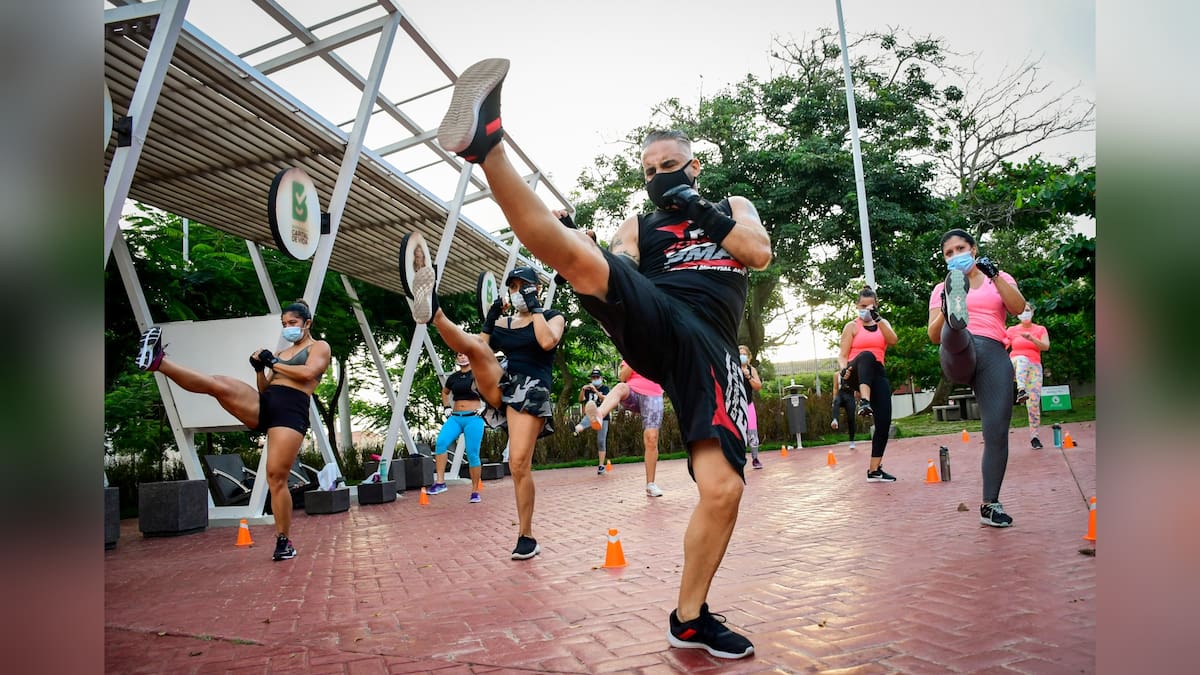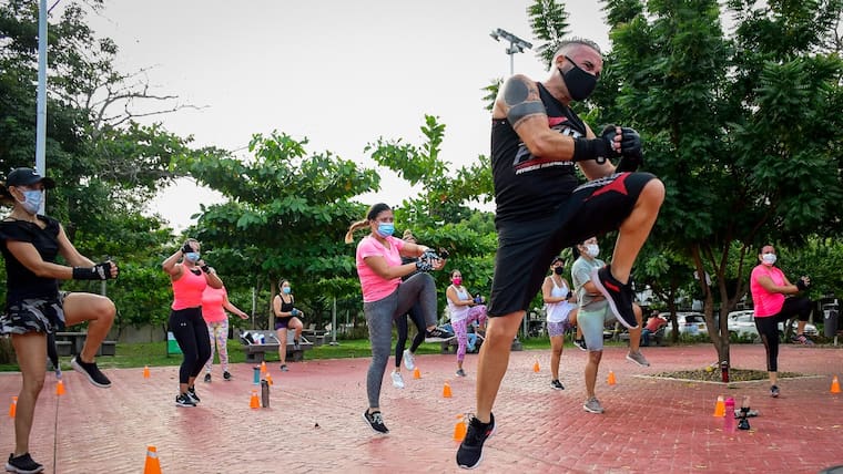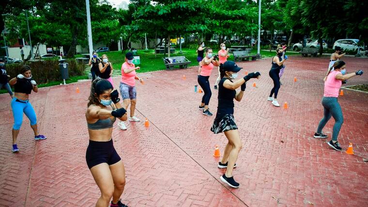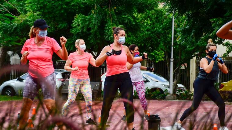 Con tapabocas y a dos metros de distancia se preparan 17 mujeres para empezar la clase en el Parque Tívoli, en el norte de Barranquilla. Los cupos para practicar son limitados por la pandemia, por tanto el aforo máximo permitido es de 20 personas, contando al instructor.