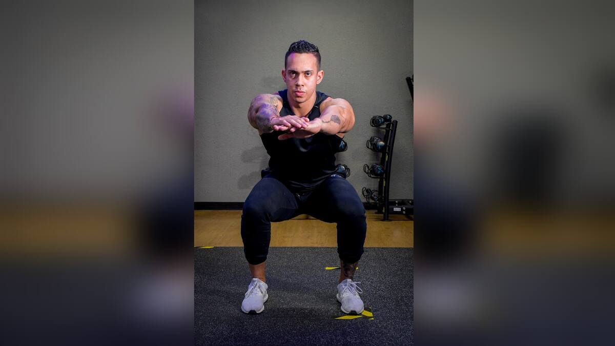 Jaime comenzó con las sentadillas, mientras que Dayma se cercioraba de que las rodillas estuviesen a la anchura de la cadera y también la mirada hacia el frente. Finalizado el set, el joven continuó con la zancada estática, el segundo ejercicio del circuito. Este trabaja las piernas y los glúteos lo que, según la entrenadora, permite tonificar y ganar masa muscular. Al terminar descansó y se hidrató.