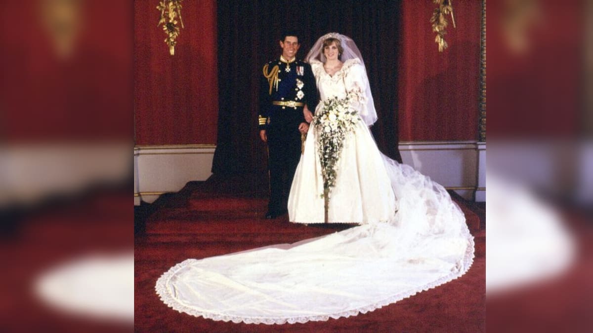 Diseñada por Elizabeth y David Emanuel, la pieza luce un corpiño ajustado superpuesto en el centro, tanto en la parte delantera como en la trasera, con paneles de encaje Carrickmacross antiguo que originalmente perteneció a la reina María, bisabuela del príncipe Carlos.